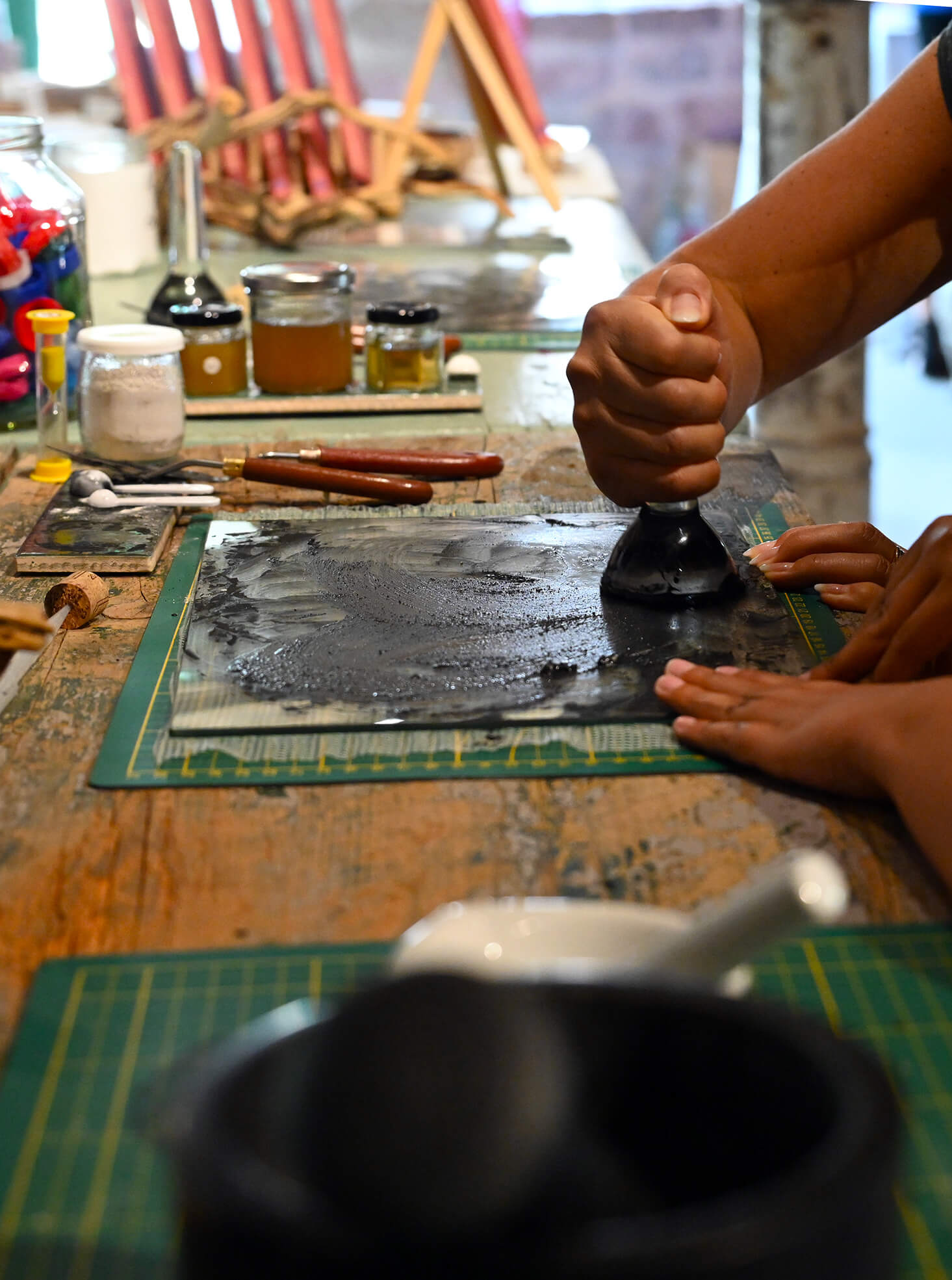 Entre gestes traditionnels et exploration des matières, cette initiation vous fera parcourir le chemin qui mène du pigment brut à la couleur prête à peindre.