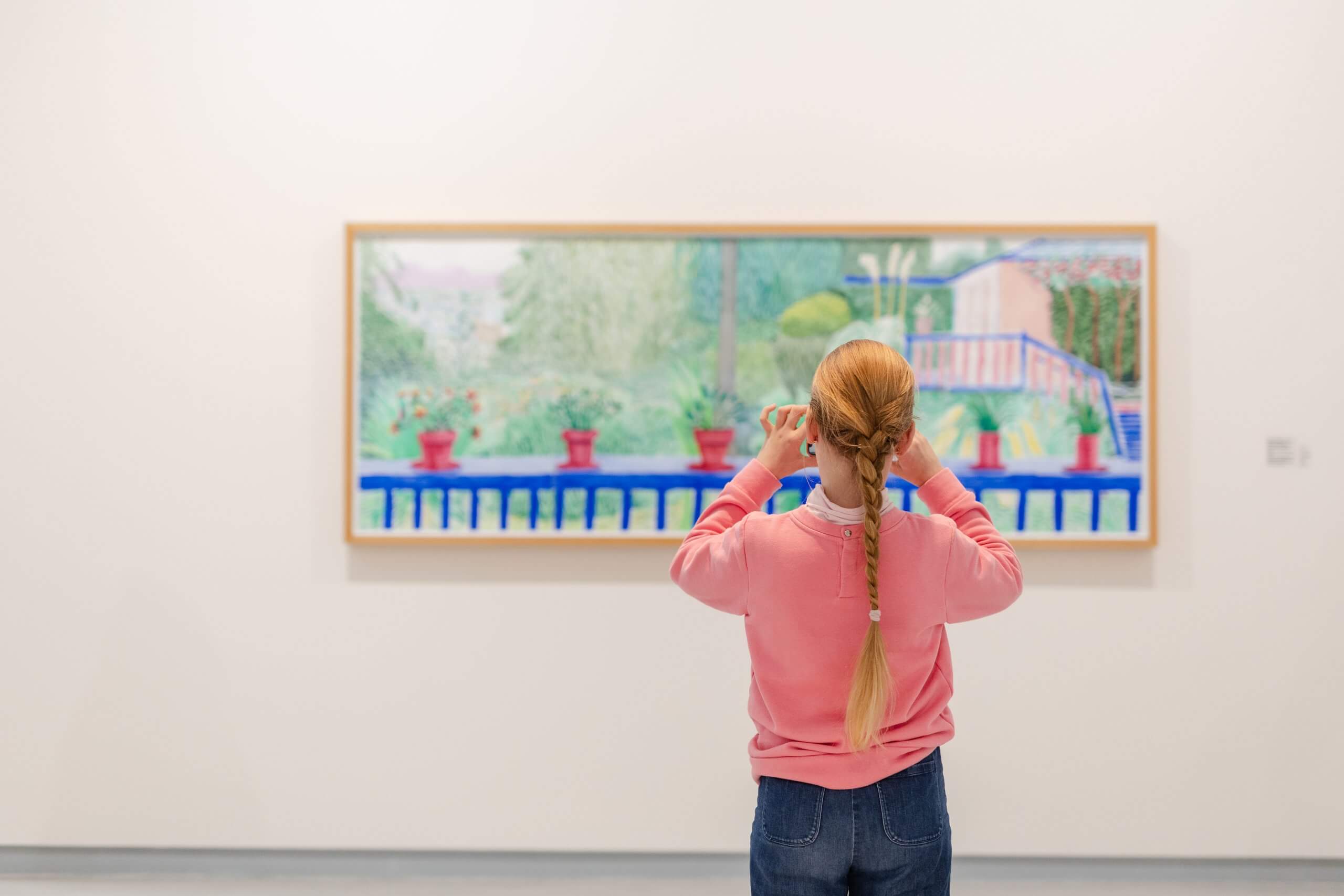 En famille, laissez-vous inspirer par l’univers lumineux et coloré de David Hockney. Depuis sa terrasse, l’artiste nous offre une vue paradisiaque : les murs roses de sa maison et les balustrades bleu cobalt contrastent magnifiquement avec une végétation luxuriante.